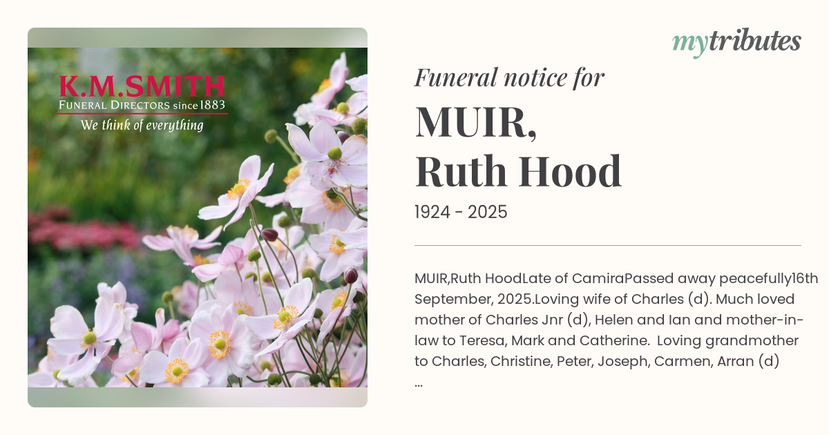 Family and friends are invited to attend a funeral service for Ruth, to be held at Heritage Park Chapel, 113 Stuart St, Goodna on Wednesday, 1st October 2025 at 12.30pm.