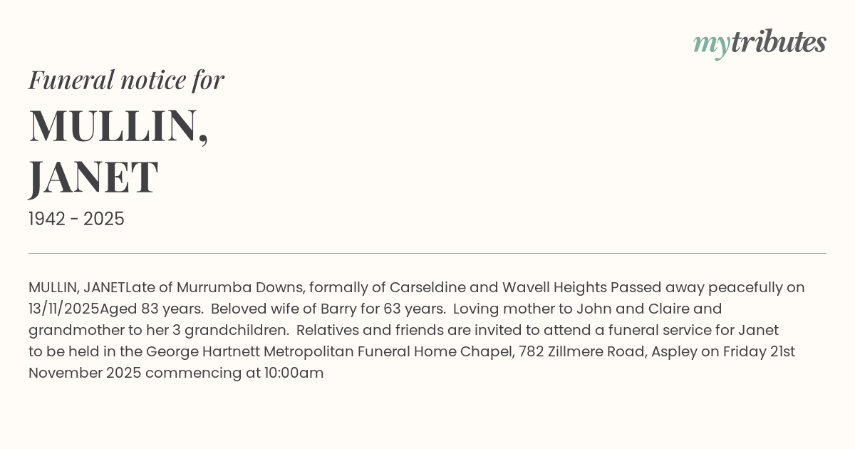 George Hartnett Metropolitan Funeral Home Chapel, 782 Zillmere Road, Aspley on Friday 21st November 2025 commencing at 10:00am
