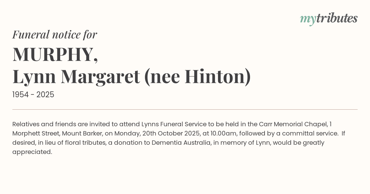 Relatives and friends are invited to attend Lynn’s Funeral Service to be held in the Carr Memorial Chapel, 1 Morphett Street, Mount Barker, on Monday, 20th October 2025, at 10.00am, followed by a committal service. If desired, in lieu of floral tributes, a donation to Dementia Australia, in memory of Lynn, would be greatly appreciated.