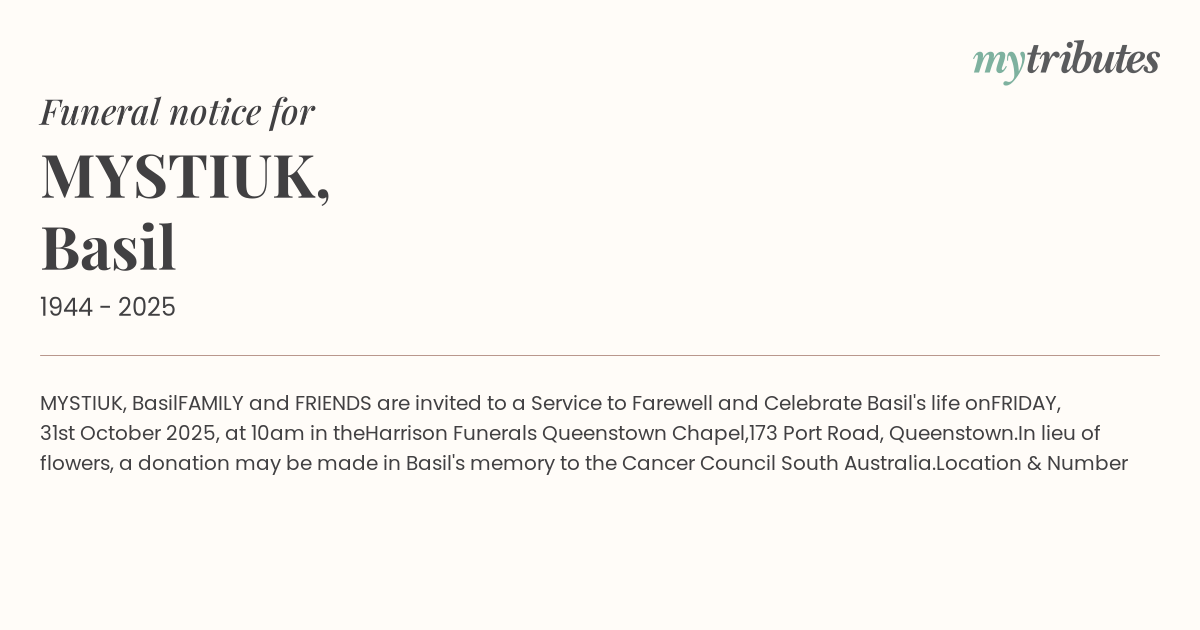 In lieu of flowers, a donation may be made in Basil's memory to the Cancer Council South Australia.