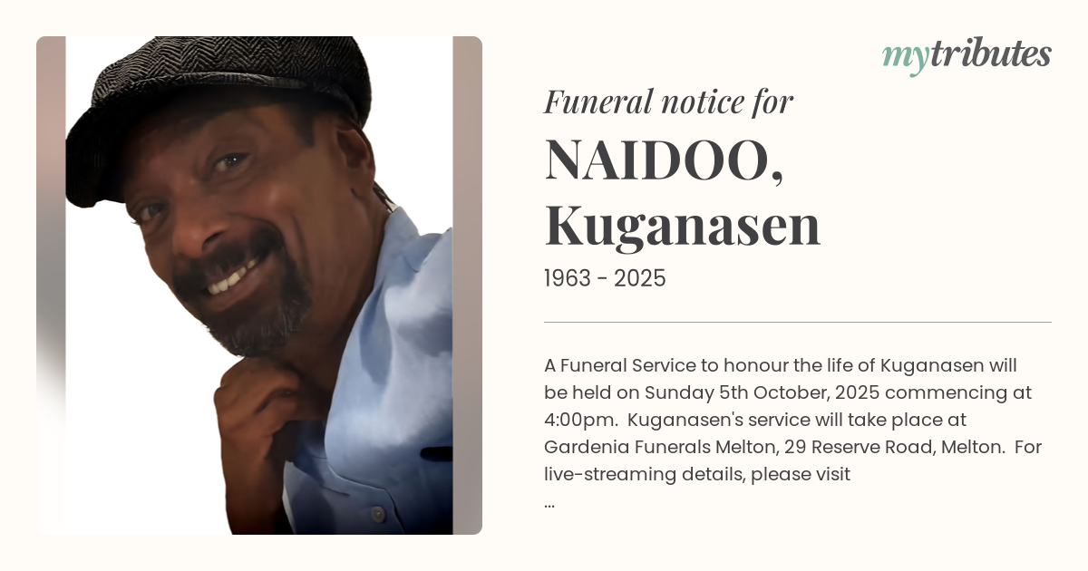For live-streaming details, please visit https://www.gardeniafunerals.com.au/view-tribute/kuganasen-naidoo-GF250322/