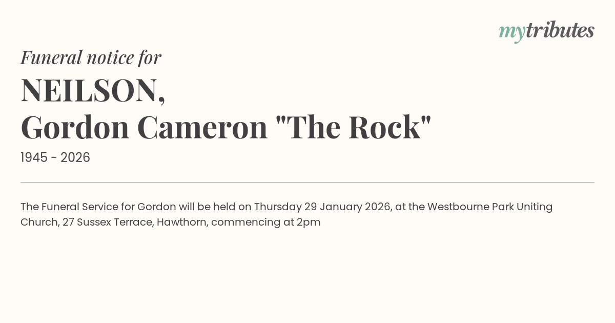 The Funeral Service for Gordon will be held on Thursday 29 January 2026, at the Westbourne Park Uniting Church, 27 Sussex Terrace, Hawthorn, commencing at 2pm
