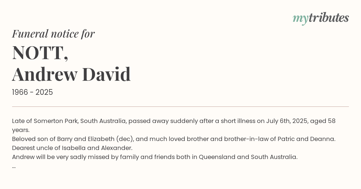 Late of Somerton Park, South Australia, passed away suddenly after a short illness on July 6th, 2025, aged 58 years.