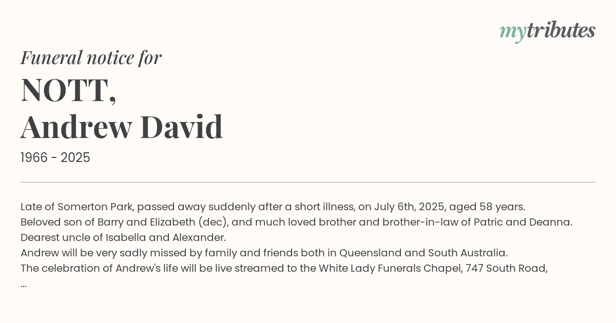 Late of Somerton Park, passed away suddenly after a short illness, on July 6th, 2025, aged 58 years.