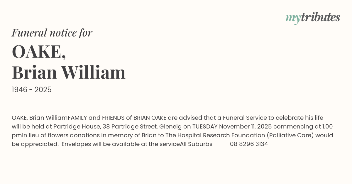 FAMILY and FRIENDS of BRIAN OAKE are advised that a Funeral Service to celebrate his life will be held at Partridge House, 38 Partridge Street, Glenelg on TUESDAY November 11, 2025 commencing at 1.00 pm