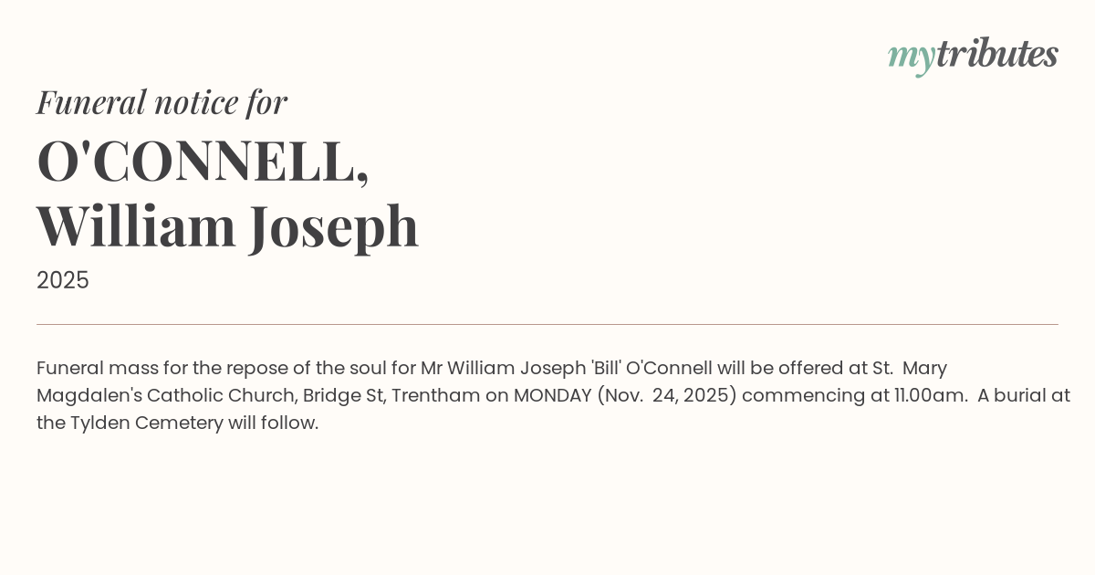 Funeral mass for the repose of the soul for Mr William Joseph 'Bill' O'Connell will be offered at St. Mary Magdalen's Catholic Church, Bridge St, Trentham on MONDAY (Nov. 24, 2025) commencing at 11.00am. A burial at the Tylden Cemetery will follow.