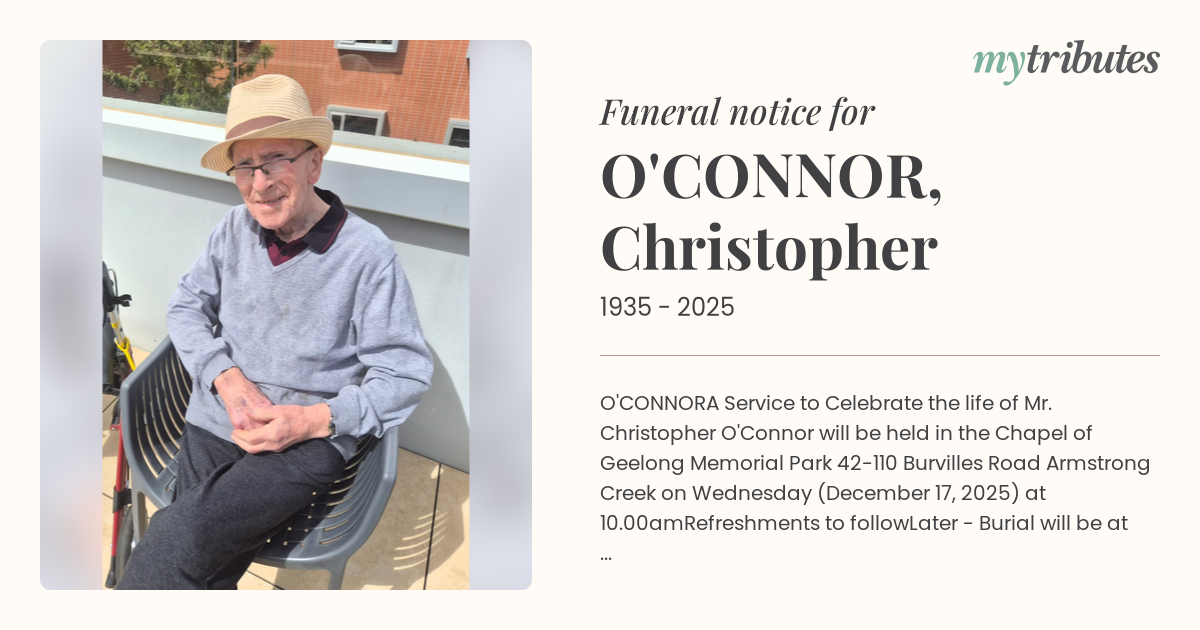 A Service to Celebrate the life of Mr. Christopher O'Connor will be held in the Chapel of Geelong Memorial Park 42-110 Burvilles Road Armstrong Creek on Wednesday (December 17, 2025) at 10.00am
