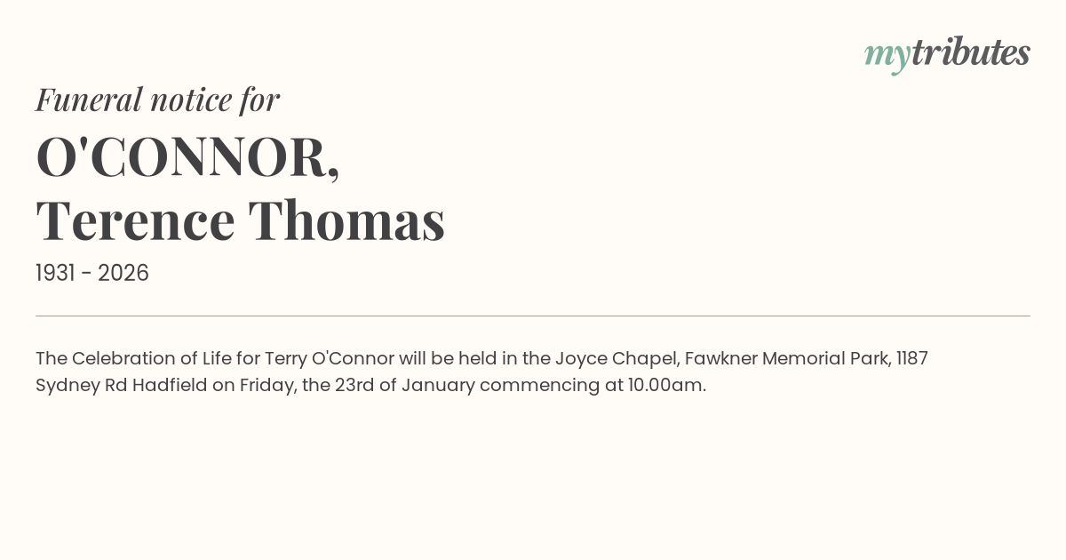 The Celebration of Life for Terry O'Connor will be held in the Joyce Chapel, Fawkner Memorial Park, 1187 Sydney Rd Hadfield on Friday, the 23rd of January commencing at 10.00am.