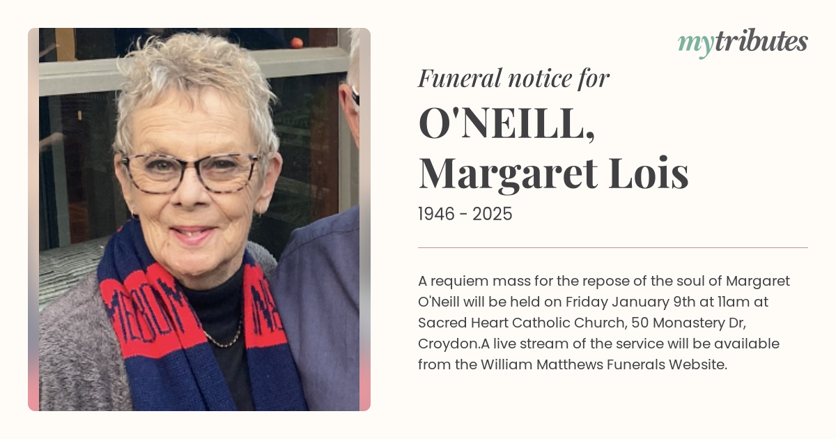 A requiem mass for the repose of the soul of Margaret O'Neill will be held on Friday January 9th at 11am at Sacred Heart Catholic Church, 50 Monastery Dr, Croydon.
