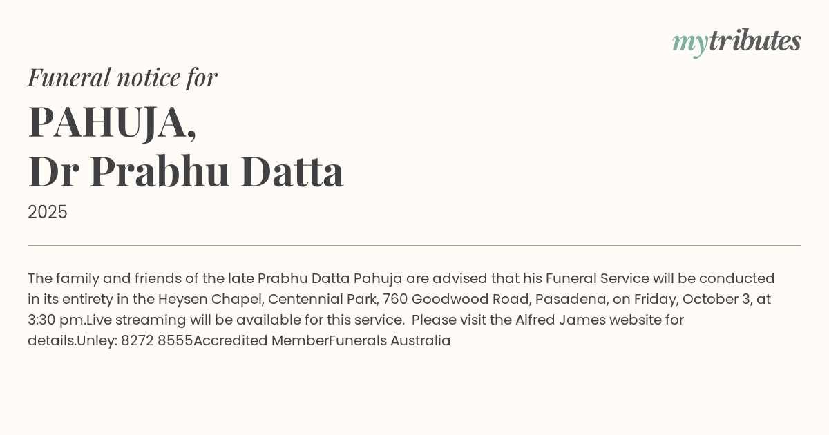 The family and friends of the late Prabhu Datta Pahuja are advised that his Funeral Service will be conducted in its entirety in the Heysen Chapel, Centennial Park, 760 Goodwood Road, Pasadena, on Friday, October 3, at 3:30 pm.