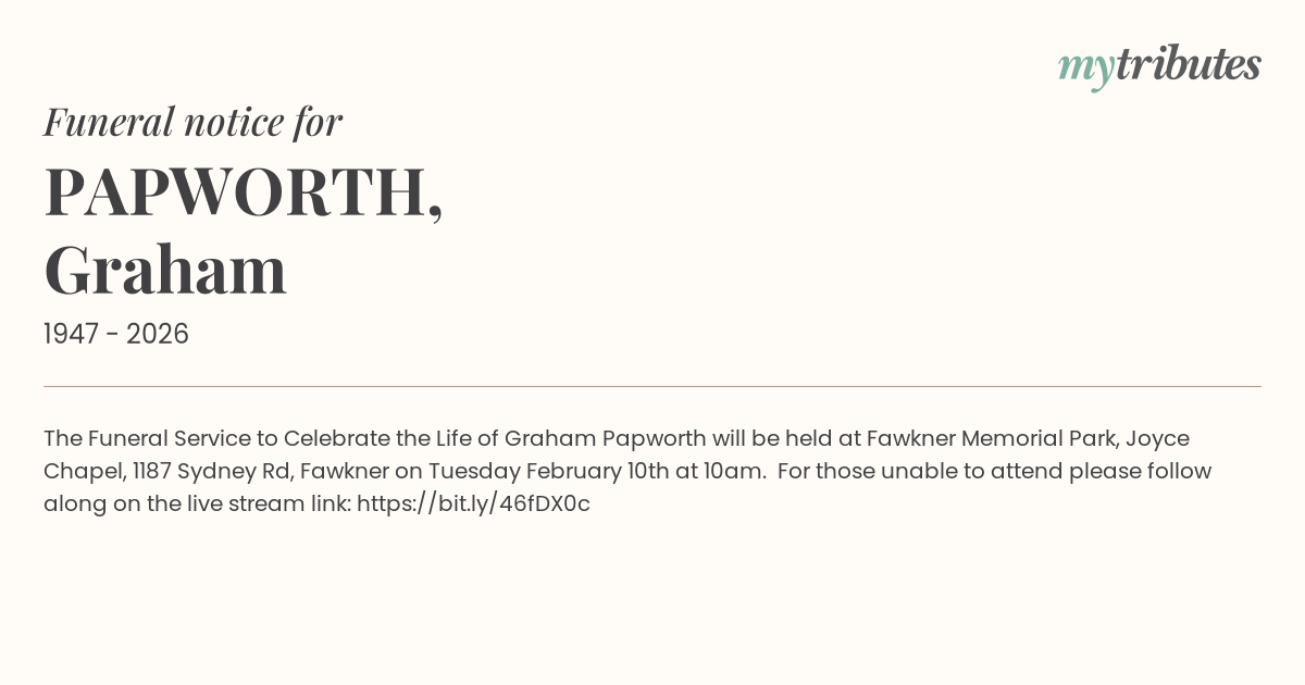 The Funeral Service to Celebrate the Life of Graham Papworth will be held at Fawkner Memorial Park, Joyce Chapel, 1187 Sydney Rd, Fawkner on Tuesday February 10th at 10am. For those unable to attend please follow along on the live stream link: https://bit.ly/46fDX0c