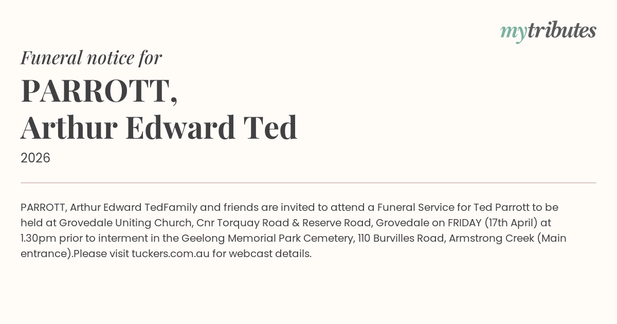 Family and friends are invited to attend a Funeral Service for Ted Parrott to be held at Grovedale Uniting Church,