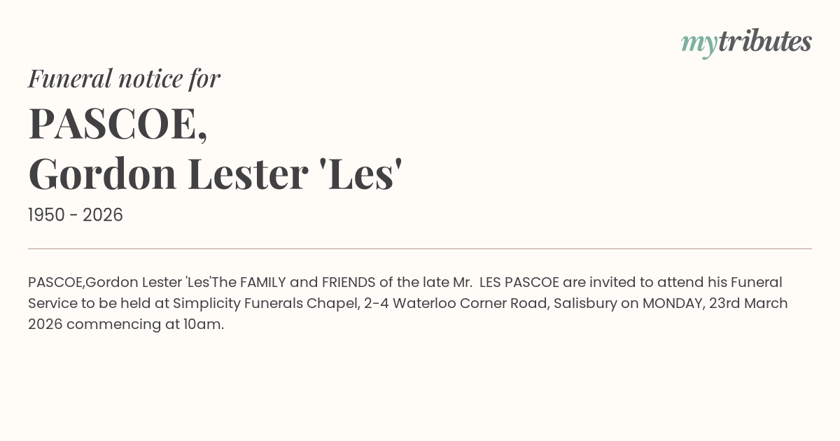 The FAMILY and FRIENDS of the late Mr. LES PASCOE are invited to attend his Funeral Service to be held at Simplicity Funerals Chapel, 2-4 Waterloo Corner Road, Salisbury on MONDAY, 23rd March 2026 commencing at 10am.