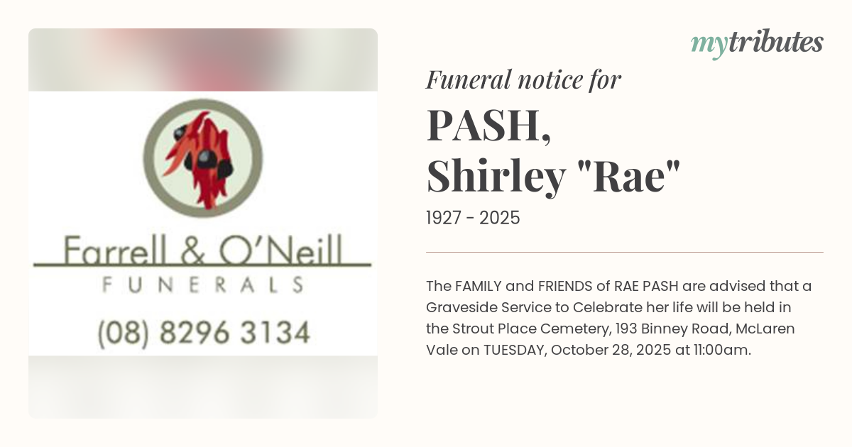 The FAMILY and FRIENDS of RAE PASH are advised that a Graveside Service to Celebrate her life will be held in the Strout Place Cemetery, 193 Binney Road, McLaren Vale on TUESDAY, October 28, 2025 at 11:00am.