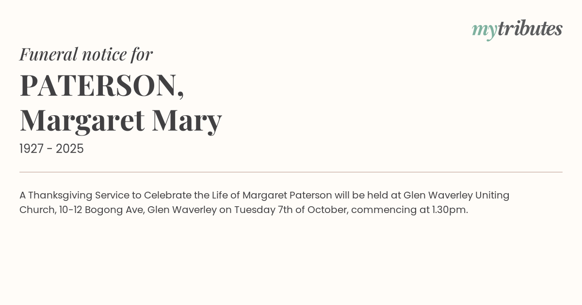 A Thanksgiving Service to Celebrate the Life of Margaret Paterson will be held at Glen Waverley Uniting Church, 10-12 Bogong Ave, Glen Waverley on Tuesday 7th of October, commencing at 1.30pm.