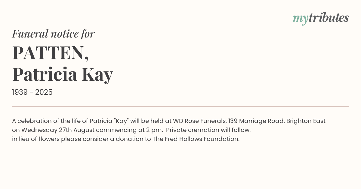 A celebration of the life of Patricia "Kay" will be held at WD Rose Funerals, 139 Marriage Road, Brighton East on Wednesday 27th August commencing at 2 pm. Private cremation will follow.