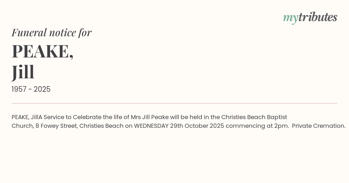 A Service to Celebrate the life of Mrs Jill Peake will be held in the Christies Beach Baptist Church, 8 Fowey Street, Christies Beach on WEDNESDAY 29th October 2025 commencing at 2pm. Private Cremation.