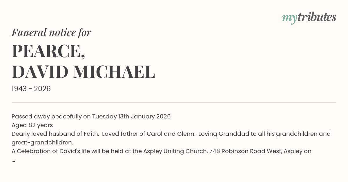 A Celebration of David's life will be held at the Aspley Uniting Church, 748 Robinson Road West, Aspley on Tuesday 27th January 2026 commencing at 10.00am.