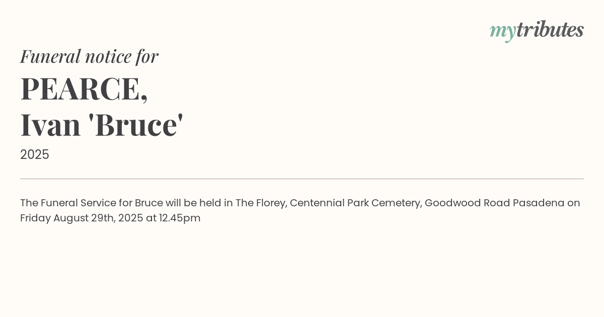 The Funeral Service for Bruce will be held in The Florey, Centennial Park Cemetery, Goodwood Road Pasadena on Friday August 29th, 2025 at 12.45pm