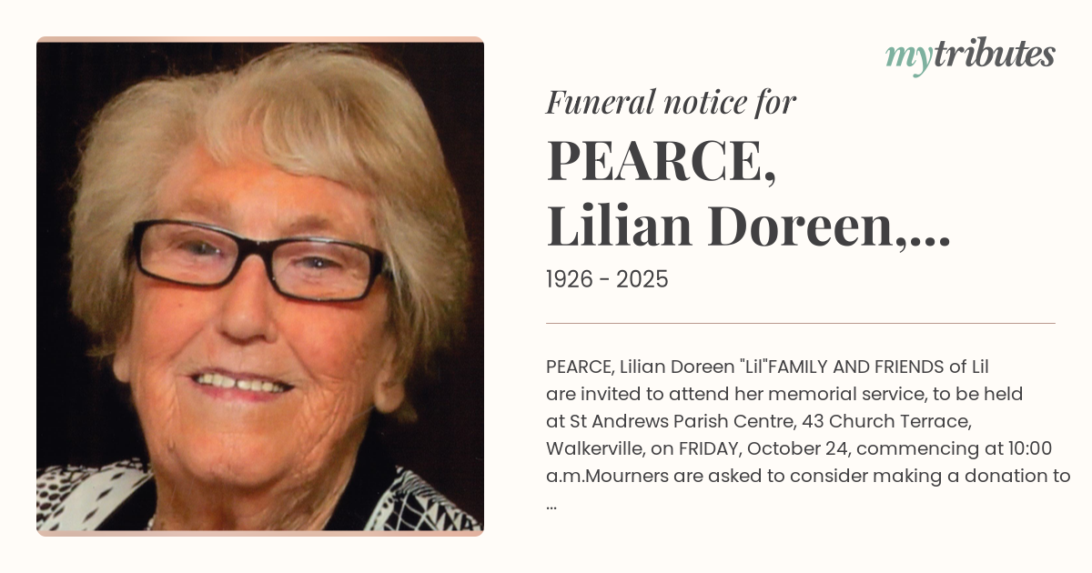 FAMILY AND FRIENDS of Lil are invited to attend her memorial service, to be held at St Andrews Parish Centre, 43 Church Terrace, Walkerville, on FRIDAY, October 24, commencing at 10:00 a.m.