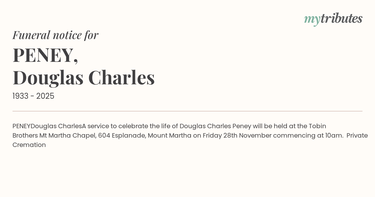 A service to celebrate the life of Douglas Charles Peney will be held at the Tobin Brothers Mt Martha Chapel, 604 Esplanade, Mount Martha on
