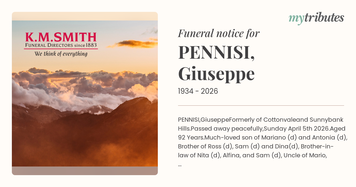 Much-loved son of Mariano (d) and Antonia (d), Brother of Ross (d), Sam (d) and Dina(d), Brother-in-law of Nita (d), Alfina, and Sam (d), Uncle of Mario, Alfie, Maria, Mario, Joseph, Tony, Joseph, Mario, Elizabeth and Ricky. Great-uncle and great-great-uncle to their families.