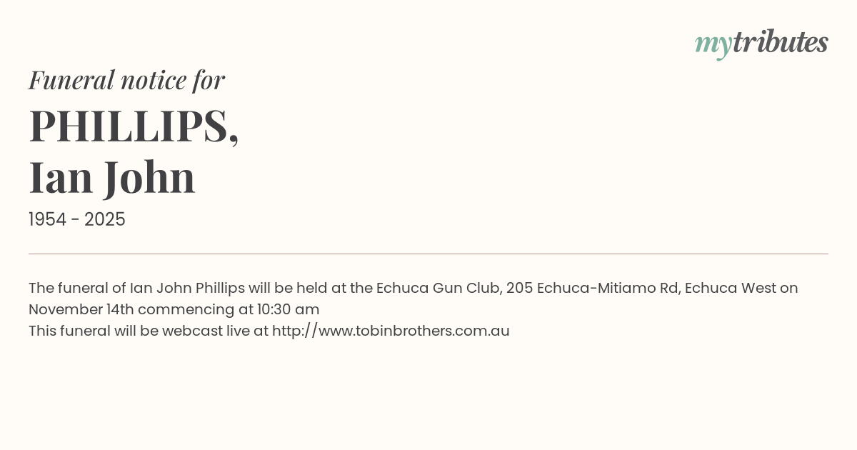 The funeral of Ian John Phillips will be held at the Echuca Gun Club, 205 Echuca-Mitiamo Rd, Echuca West on November 14th commencing at 10:30 am