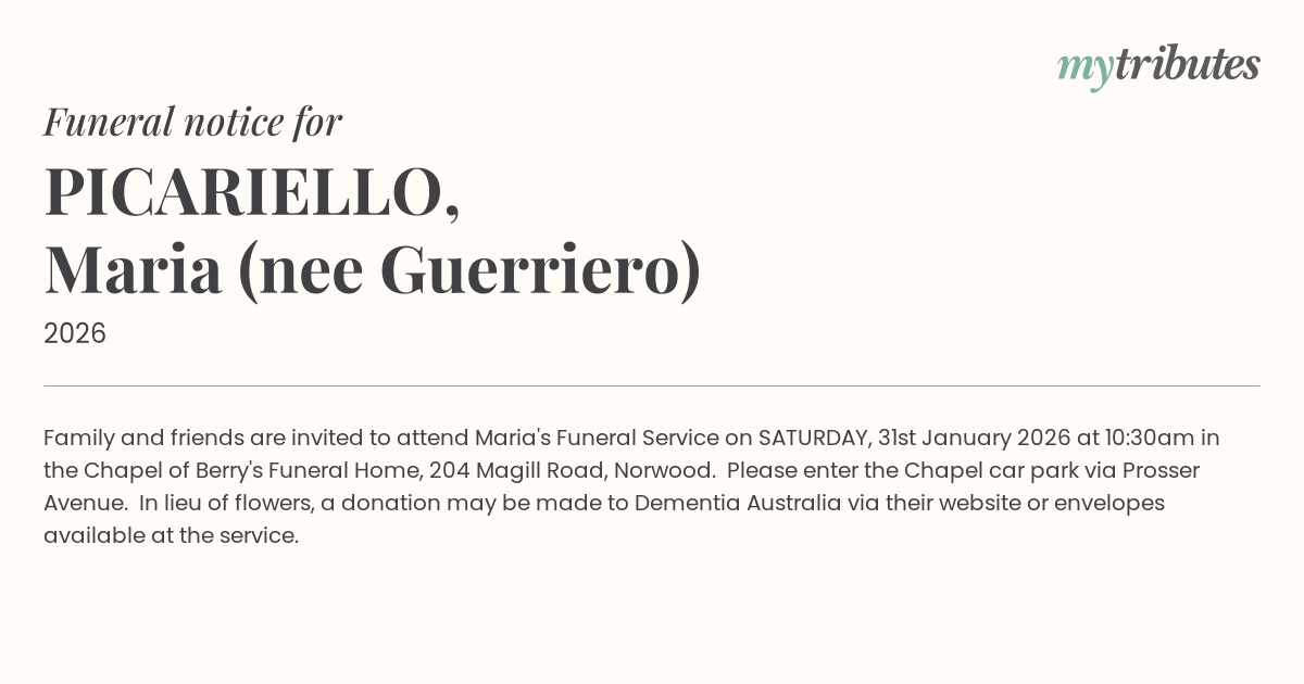 Family and friends are invited to attend Maria's Funeral Service on SATURDAY, 31st January 2026 at 10:30am in the Chapel of Berry's Funeral Home, 204 Magill Road, Norwood.