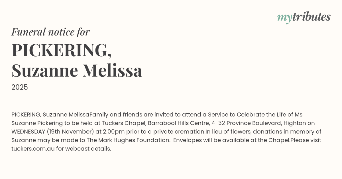 Family and friends are invited to attend a Service to Celebrate the Life of Ms Suzanne Pickering to be held at Tuckers Chapel, Barrabool Hills Centre, 4-32 Province Boulevard, Highton on WEDNESDAY (19th November) at 2.00pm prior to a private cremation.