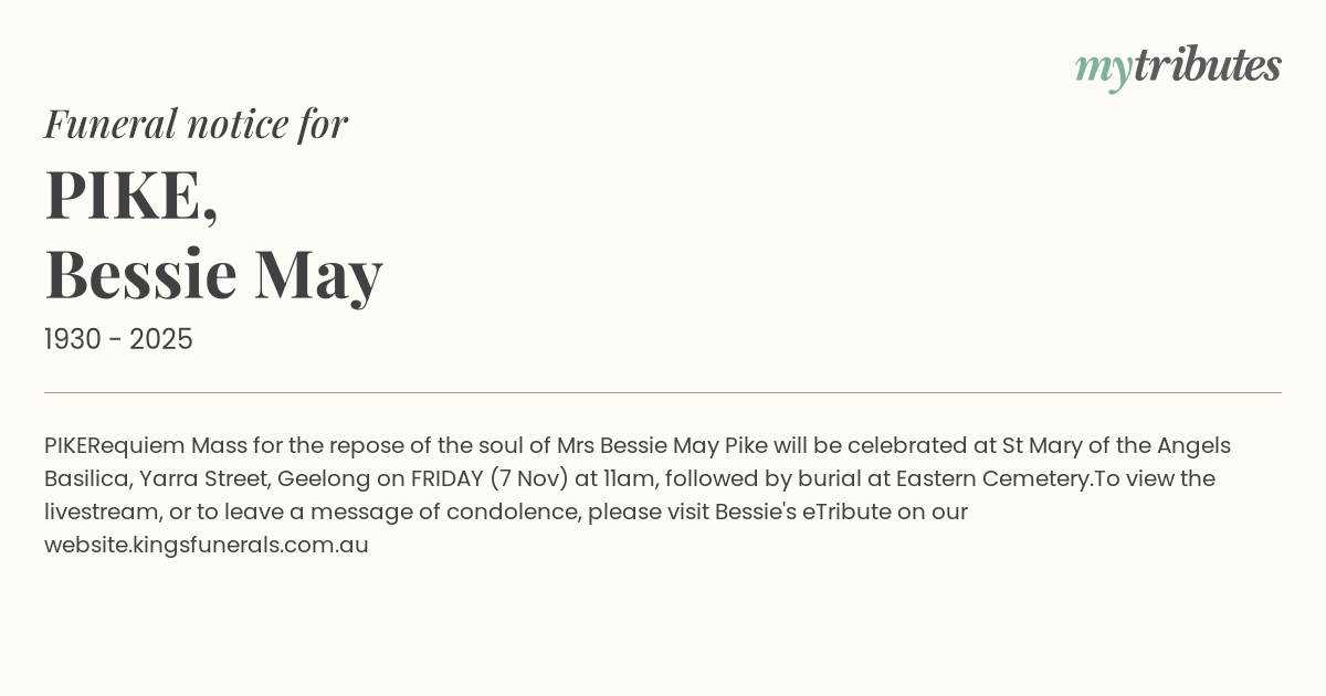 Mrs Bessie May Pike will be celebrated at St Mary of the Angels Basilica, Yarra Street, Geelong on FRIDAY (7 Nov) at 11am, followed by burial at Eastern Cemetery.