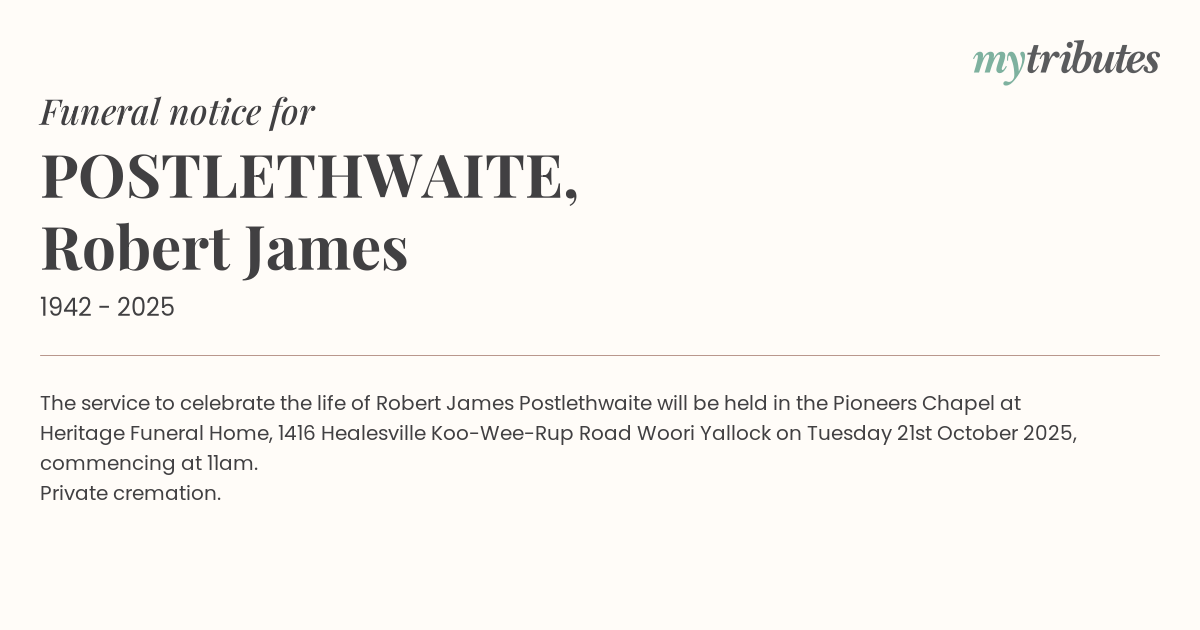 The service to celebrate the life of Robert James Postlethwaite will be held in the Pioneers Chapel at Heritage Funeral Home, 1416 Healesville Koo-Wee-Rup Road Woori Yallock on Tuesday 21st October 2025, commencing at 11am. Private cremation.