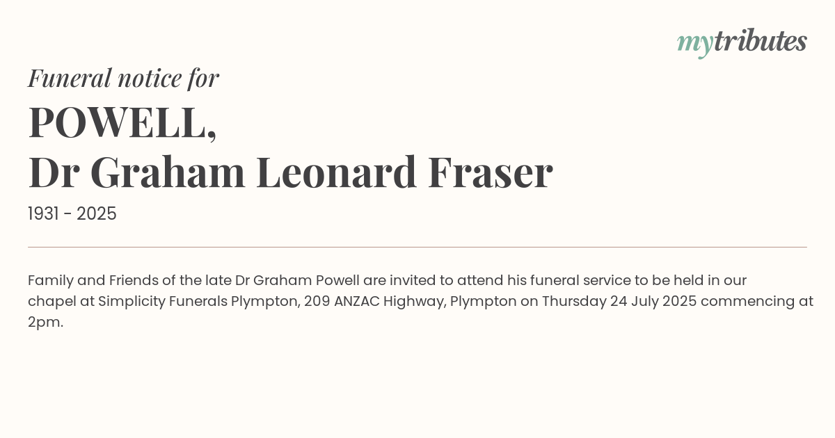 Family and Friends of the late Dr Graham Powell are invited to attend his funeral service to be held in our chapel at Simplicity Funerals Plympton, 209 ANZAC Highway, Plympton on Thursday 24 July 2025 commencing at 2pm.
