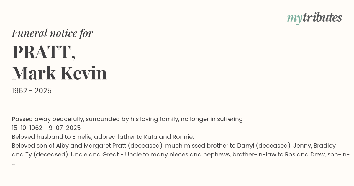 Beloved son of Alby and Margaret Pratt (deceased), much missed brother to Darryl (deceased), Jenny, Bradley and Ty (deceased). Uncle and Great - Uncle to many nieces and nephews, brother-in-law to Ros and Drew, son-in-law to Ignacio and Emilia and friend to many