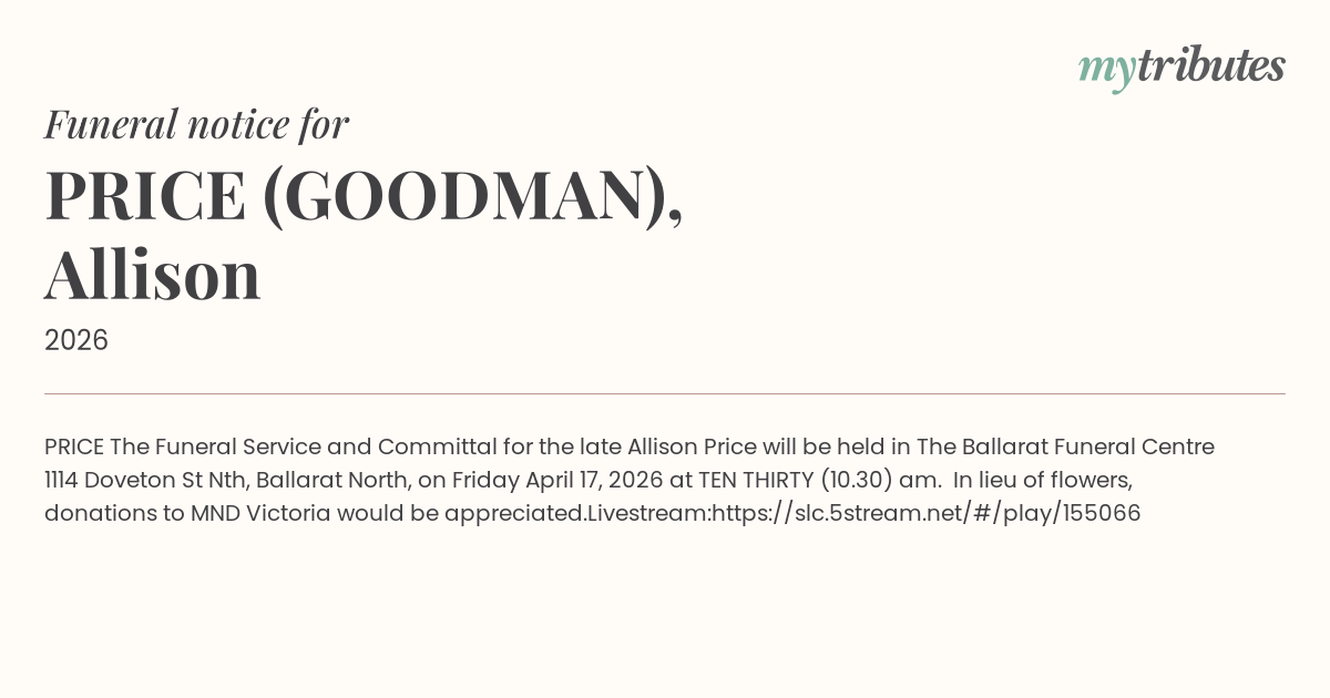 The Funeral Service and Committal for the late Allison Price will be held in “The Ballarat Funeral Centre” 1114 Doveton St Nth, Ballarat North, on Friday April 17, 2026 at TEN THIRTY (10.30) am.