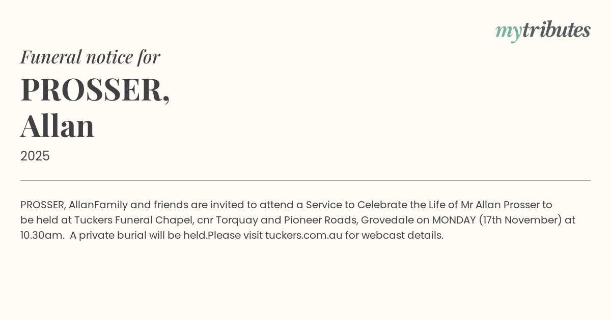 Family and friends are invited to attend a Service to Celebrate the Life of Mr Allan Prosser to be held at Tuckers Funeral Chapel, cnr Torquay and Pioneer Roads, Grovedale on MONDAY (17th November) at 10.30am.