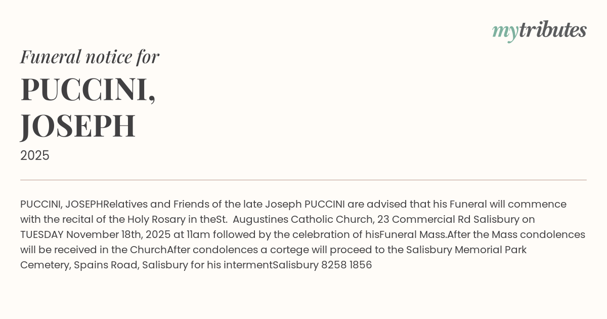 Relatives and Friends of the late Joseph PUCCINI are advised that his Funeral will commence with the recital of the Holy Rosary in the