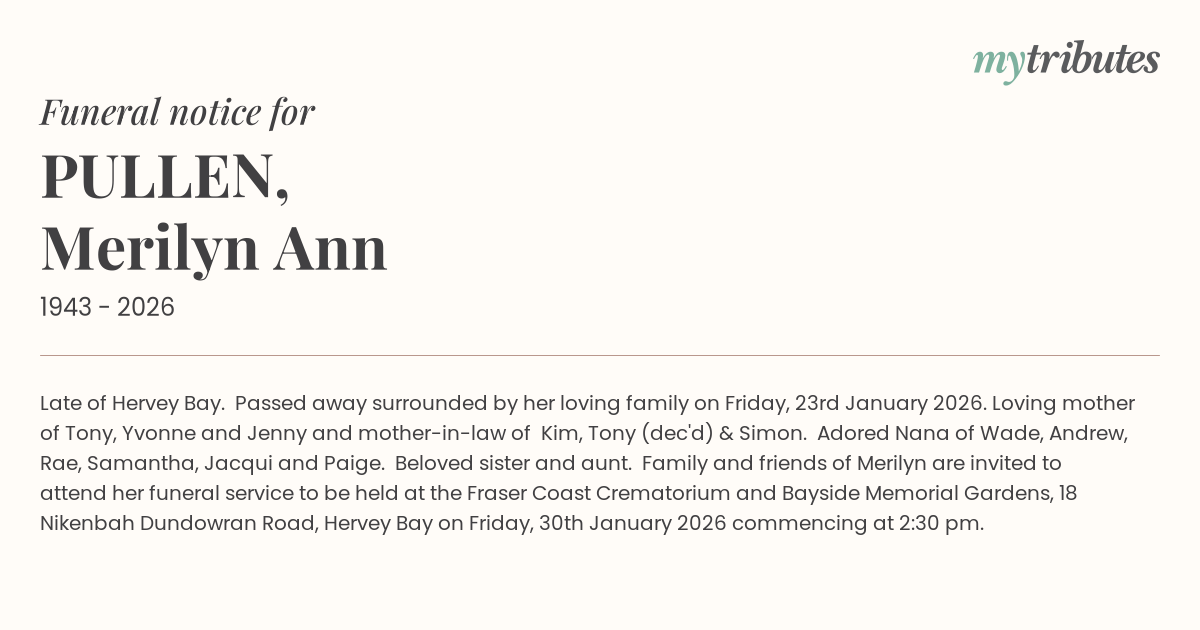 Late of Hervey Bay. Passed away surrounded by her loving family on Friday, 23rd January 2026. Loving mother of Tony, Yvonne and Jenny and mother-in-law of Kim, Tony (dec'd) & Simon. Adored Nana of Wade, Andrew, Rae, Samantha, Jacqui and Paige. Beloved sister and aunt. Family and friends of Merilyn are invited to attend her funeral service to be held at the Fraser Coast Crematorium and Bayside Memorial Gardens, 18 Nikenbah Dundowran Road, Hervey Bay on Friday, 30th January 2026 commencing at 2:30 pm.