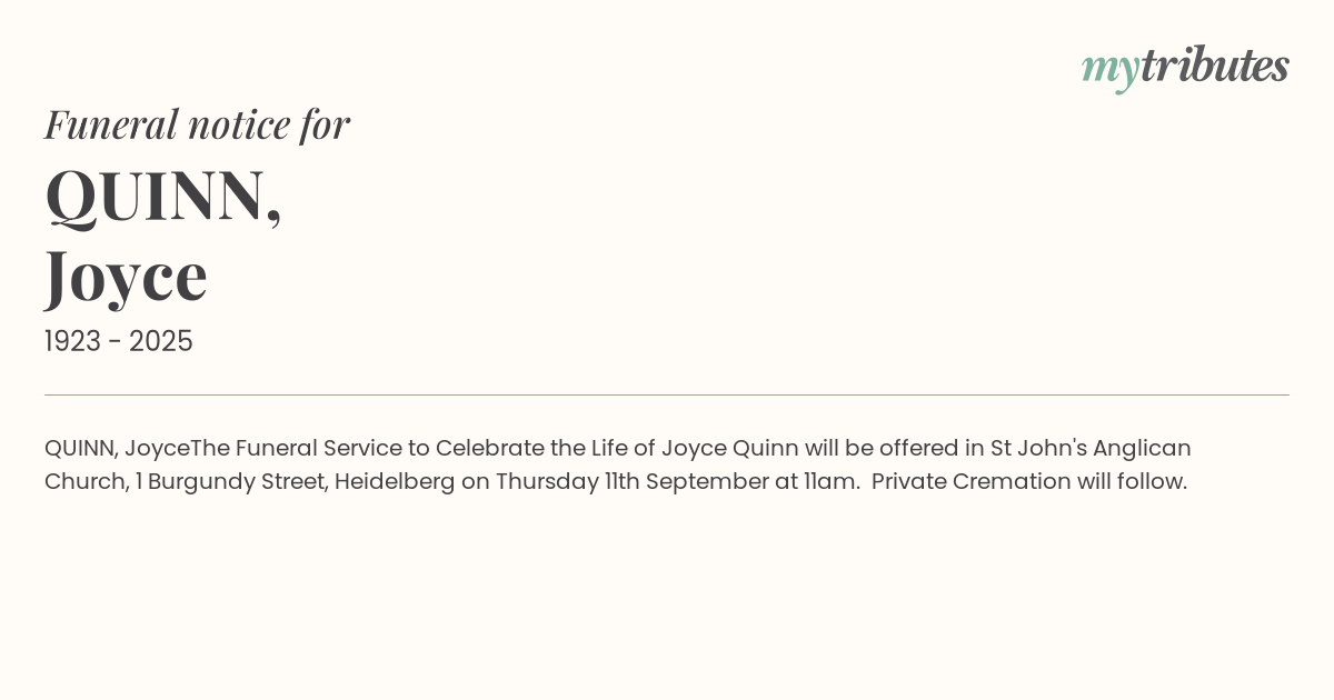 The Funeral Service to Celebrate the Life of Joyce Quinn will be offered in St John's Anglican Church, 1 Burgundy Street, Heidelberg on Thursday 11th September at 11am. Private Cremation will follow.