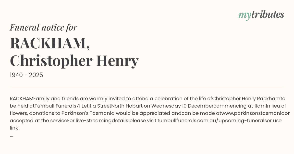In lieu of flowers, donations to Parkinson's Tasmania would be appreciated and