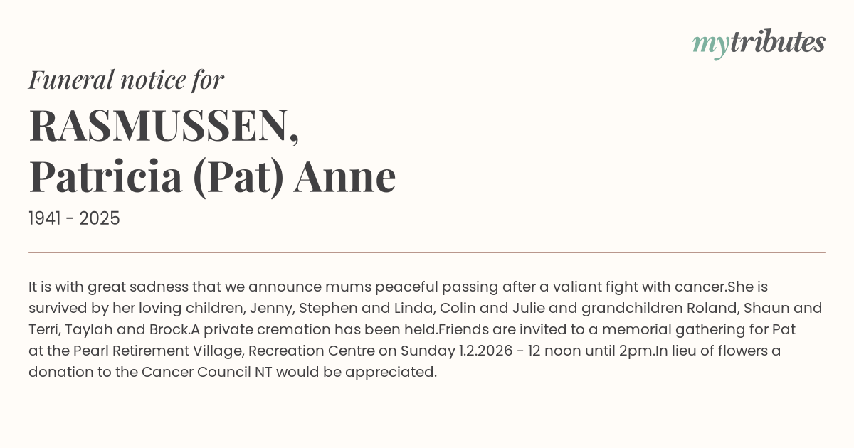 Friends are invited to a memorial gathering for Pat at the Pearl Retirement Village, Recreation Centre on Sunday 1.2.2026 - 12 noon until 2pm.