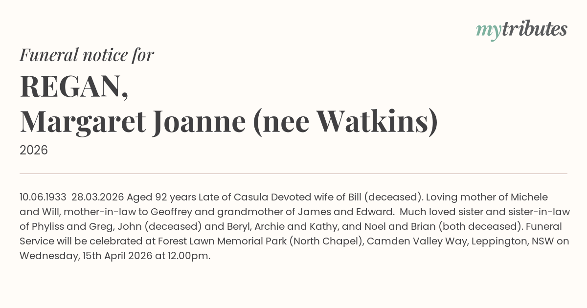 Funeral Service will be celebrated at Forest Lawn Memorial Park (North Chapel), Camden Valley Way, Leppington, NSW on Wednesday, 15th April 2026 at 12.00pm.