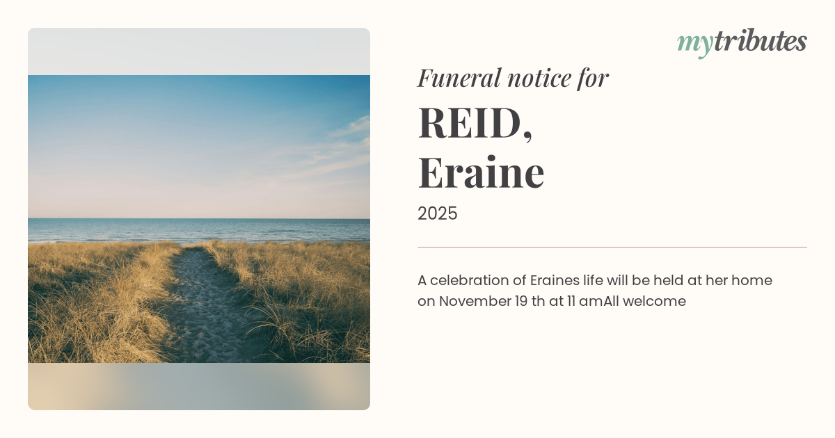A celebration of Eraine’s life will be held at her home on November 19 th at 11 amAll welcome