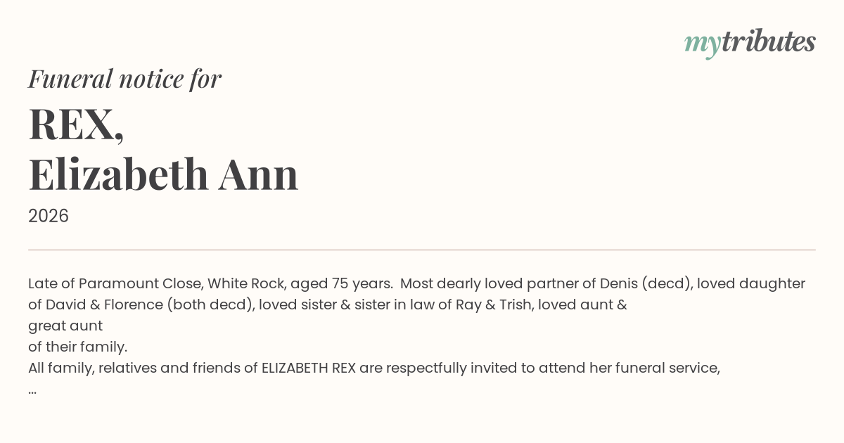 All family, relatives and friends of ELIZABETH REX are respectfully invited to attend her funeral service, which will be held on MONDAY AFTERNOON 19th January 2026, commencing at 1.00pm in the Chapel of Heritage Brady Funeral Directors Crematorium,