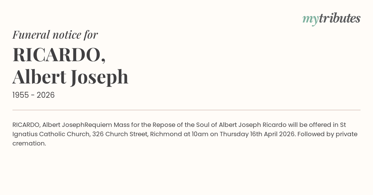 Requiem Mass for the Repose of the Soul of Albert Joseph Ricardo will be offered in St Ignatius Catholic Church, 326 Church Street, Richmond at 10am on Thursday 16th April 2026.