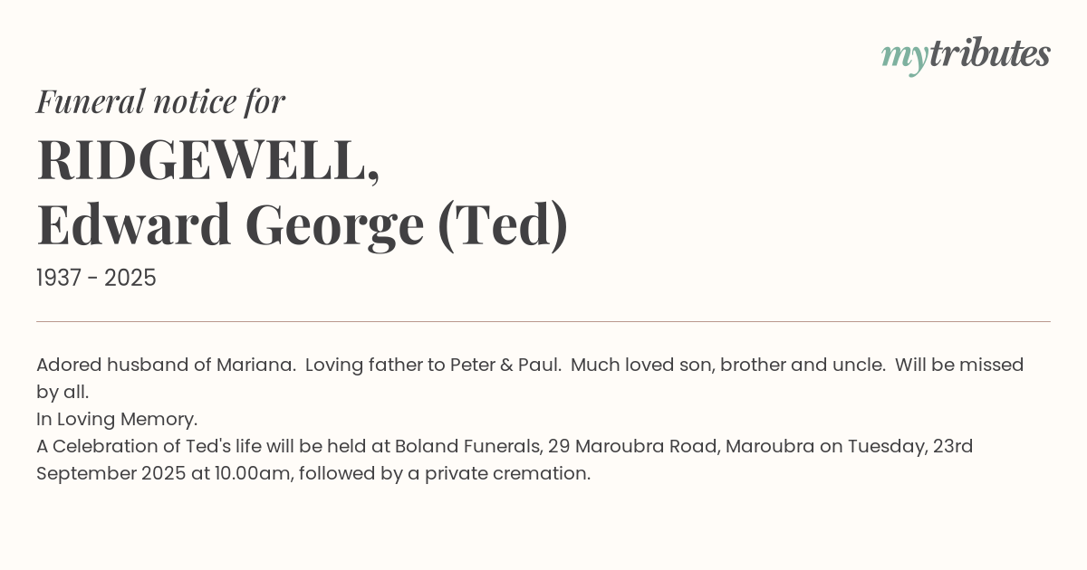 A Celebration of Ted's life will be held at Boland Funerals, 29 Maroubra Road, Maroubra on Tuesday, 23rd September 2025 at 10.00am, followed by a private cremation.