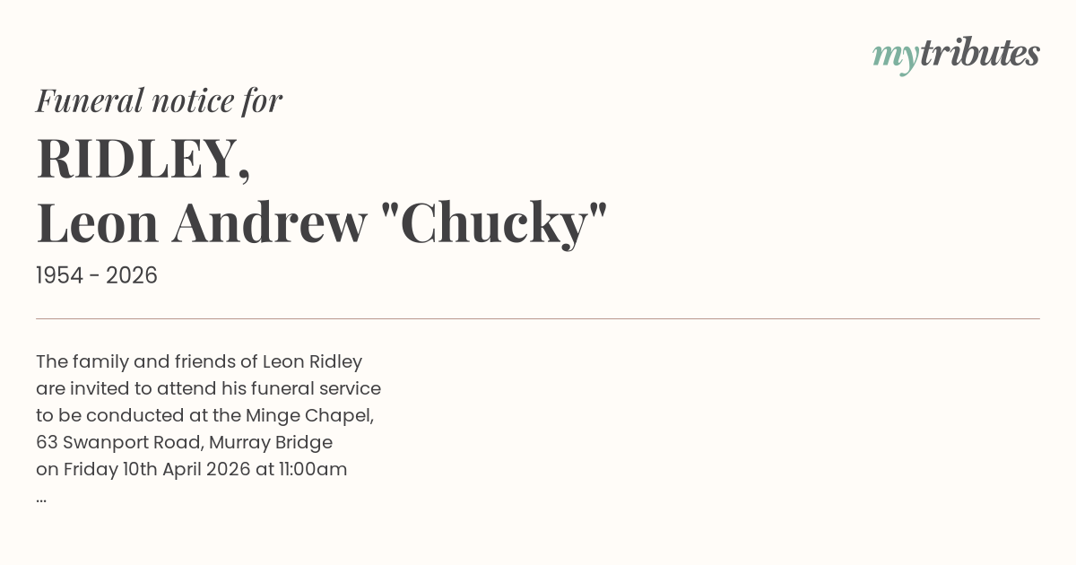 The family and friends of Leon Ridley are invited to attend his funeral service to be conducted at the Minge Chapel, 63 Swanport Road, Murray Bridge on Friday 10th April 2026 at 11:00am followed by a private cremation