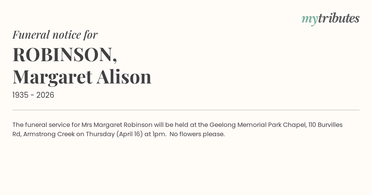 The funeral service for Mrs Margaret Robinson will be held at the Geelong Memorial Park Chapel, 110 Burvilles Rd, Armstrong Creek on Thursday (April 16) at 1pm. No flowers please.