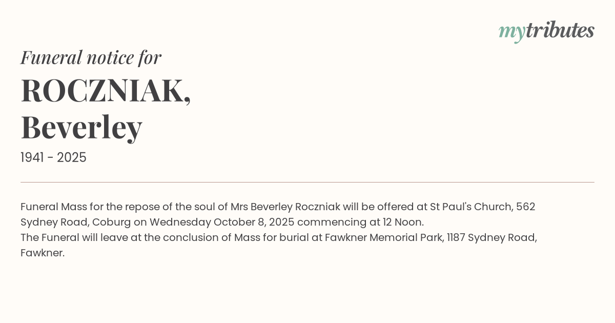 Funeral Mass for the repose of the soul of Mrs Beverley Roczniak will be offered at St Paul's Church, 562 Sydney Road, Coburg on Wednesday October 8, 2025 commencing at 12 Noon.