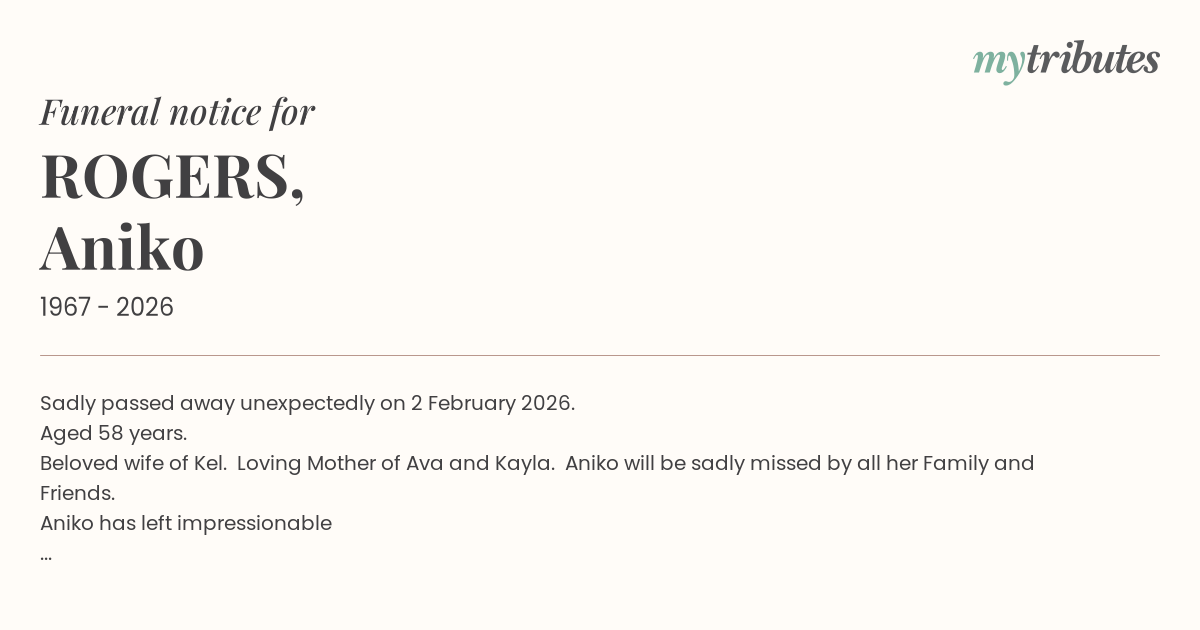 Beloved wife of Kel. Loving Mother of Ava and Kayla. Aniko will be sadly missed by all her Family and Friends.