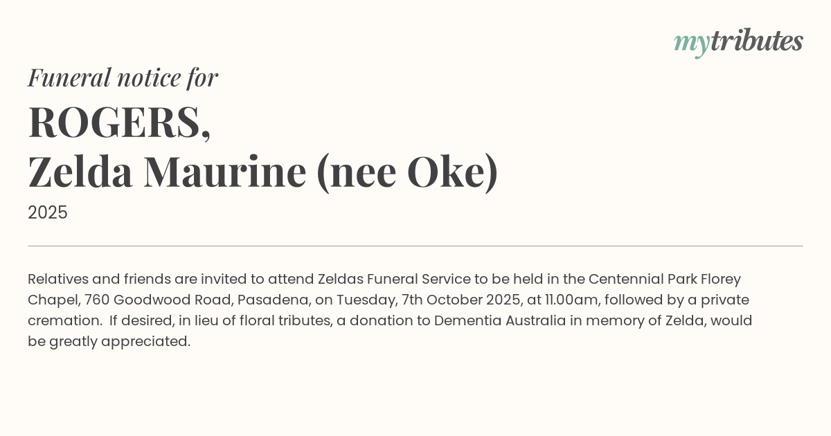 Relatives and friends are invited to attend Zelda’s Funeral Service to be held in the Centennial Park Florey Chapel, 760 Goodwood Road, Pasadena, on Tuesday, 7th October 2025, at 11.00am, followed by a private cremation. If desired, in lieu of floral tributes, a donation to Dementia Australia in memory of Zelda, would be greatly appreciated.